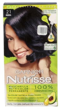Presentación con caja con 1 aplicador con crema reveladora capilar 67,5 mL 1 tubo con crema colorante capilar de 45 g 1 frasco con tratamiento capilar nutritivo 40 mL 1 ampolleta con aceite capilar mineral y de uva 4,5 mL 1 par de guantes profesionales, 1 instructivo Contiene aceite de uva, aceite mineral, aceite de aguacate 21 Mora - Negro Azulado Uso capilar / tinte
